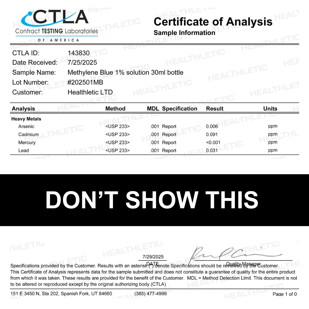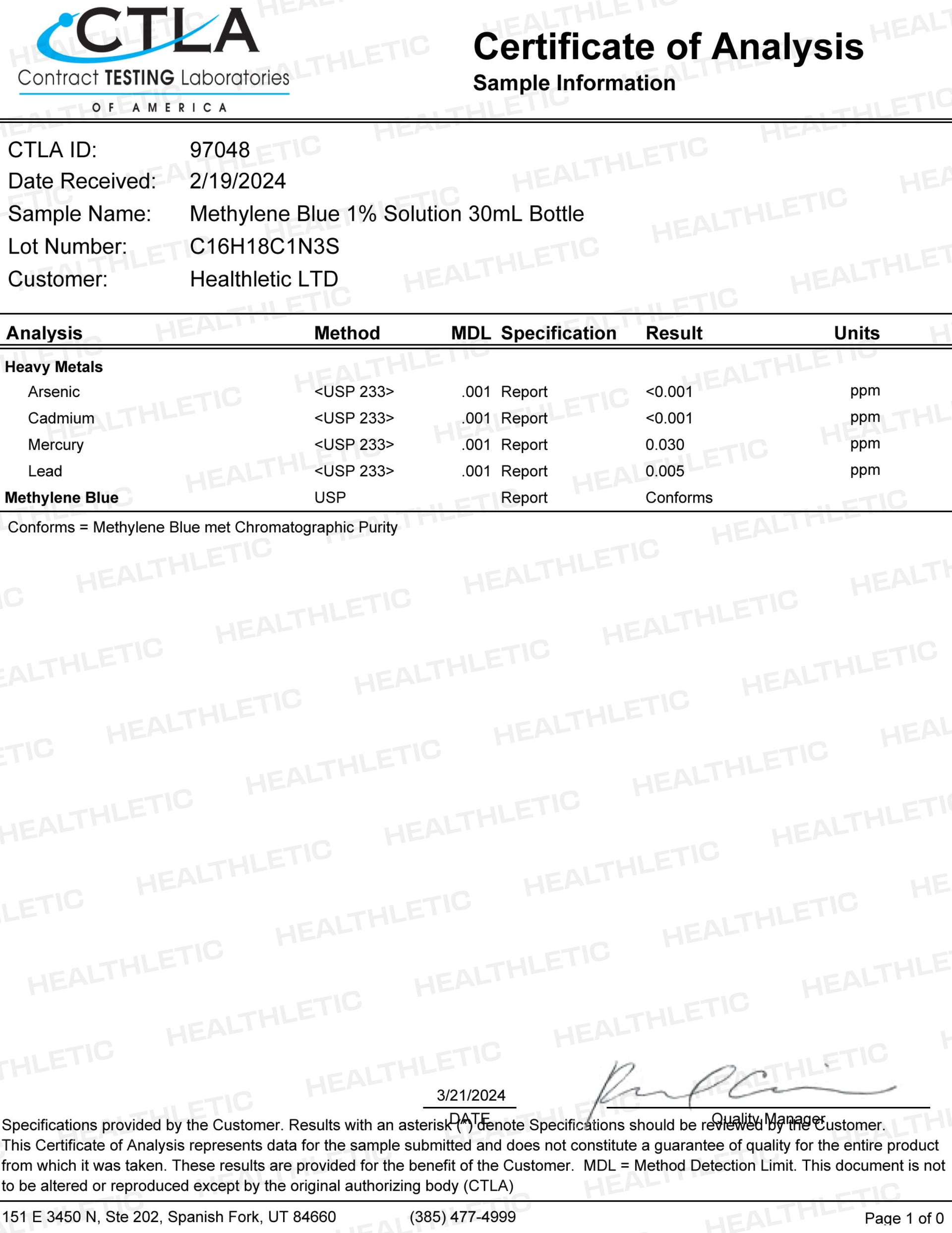 All of Our Methylene Blue Batches are tested via 3rd party lab tests.
