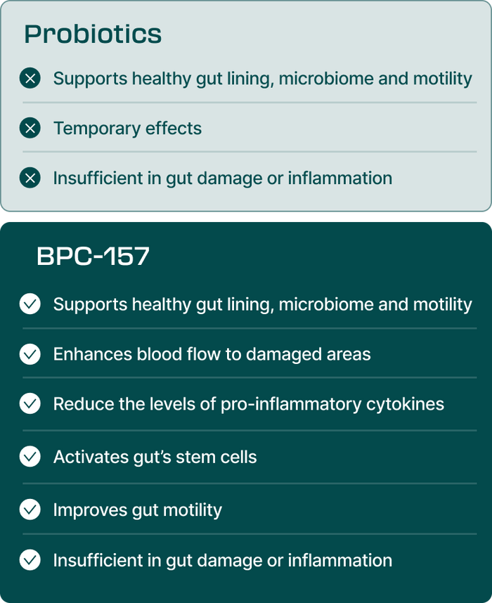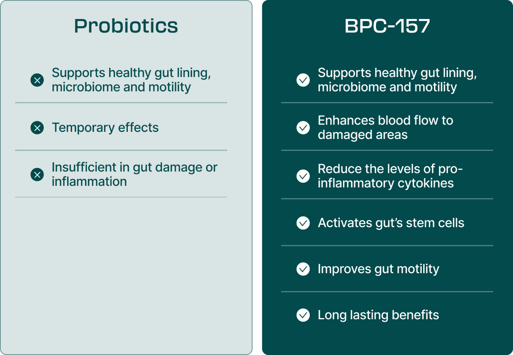 BPC 157 directly repairs the gut lining and reduces chronic inflammation, while probiotics primarily address the microbial balance in the gut.