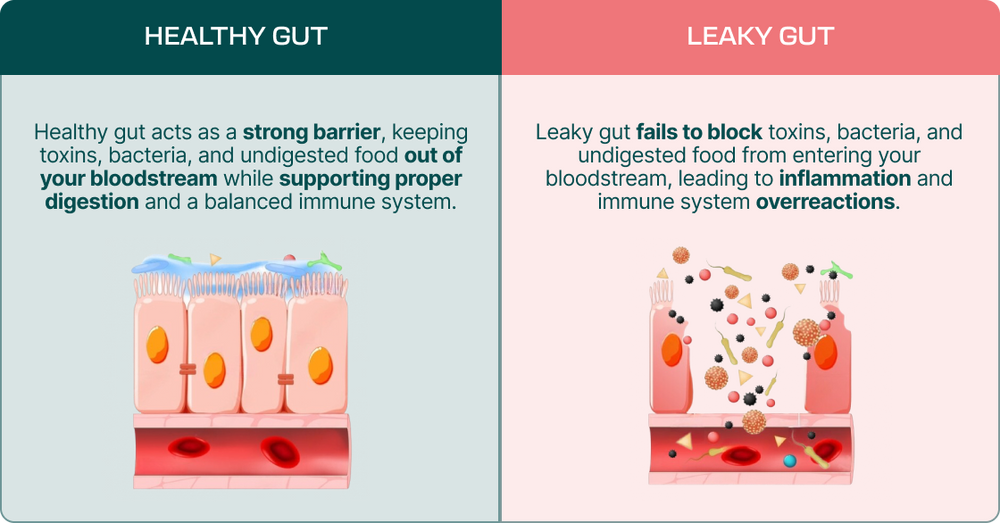 Leaky gut happens when the lining of your intestines gets damaged, letting harmful stuff like toxins, bacteria, and undigested food slip into your bloodstream. This can cause inflammation and make your immune system overreact.
